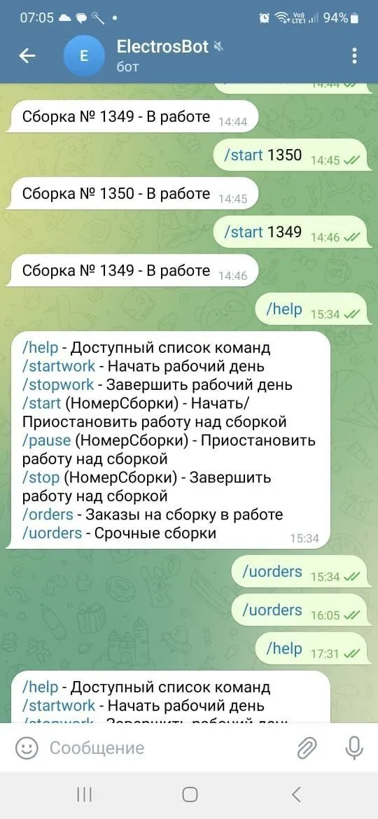 Ну, и, конечно, мы, как всегда, стали меняться информационно. Из самого забавного: мы сделали чат-бот в телеграмме и связали его с нашей 1С. (Я же говорил. что когда-нибудь наша 1С захватит этот мир) . Этот чат-бот позволяет нам учитывать рабочее время монтажников на работе, понимать, кто над какой сборкой работает, назначать приоритетные сборки монтажникам и т.д.